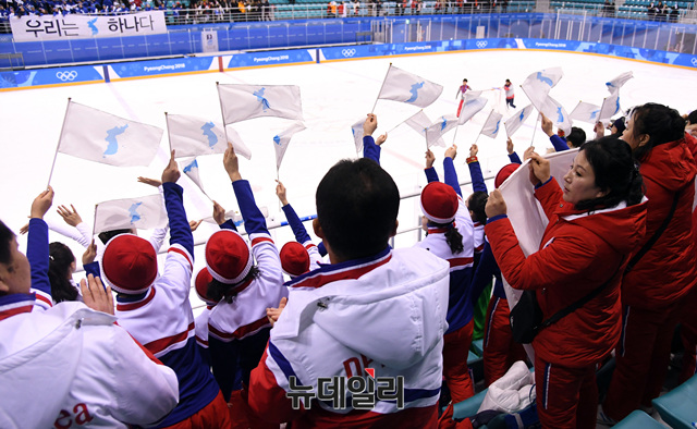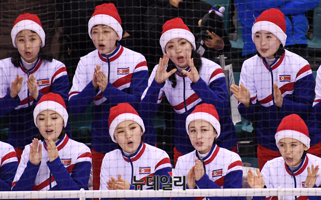 북한응원단이 12일 오후 강원도 강릉시 관동하키센터에서 열린 여자 아이스하키 남북단일팀 조별예선 2차전 스웨덴과의 경기를 지켜보고 있다.
