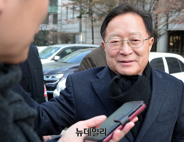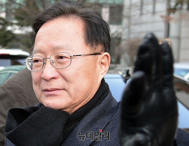 송희영 전 조선일보 주필이 13일 오후 서울중앙지법에서 열린 1심 선거공판 후 법원을 나서고 있다.