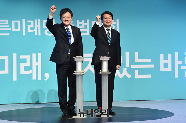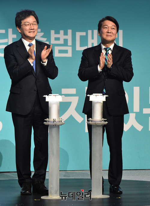 유승민 바른정당대표와 안철수 국민의당 대표가 13일 오후 경기 고양시 킨텍스에서 열린 바른미래당 출범대회에서 개회를 알리는 버튼을 누르고 박수를 치고 있다.