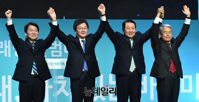 김동철 바른미래당 원내대표 박주선 바른미래당 공동대표, 유승민 공동대표, 안철수 국민의당 전 대표가 13일 오후 경기 고양시 킨텍스에서 열린 바른미래당 출범대회에서 손을 맞잡아 인사하고 있다.