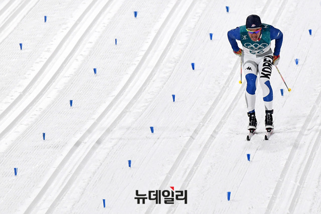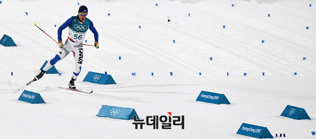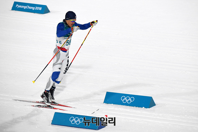 13일 오후 강원도 평창 알펜시아 크로스컨트리센터에서 열린 2018 평창동계올림픽 크로스컨트리 스키 남자 스프린트 클래식 예선에 출전한 김 마그너스가 역주를 펼치고 있다. (사진=평창2018사진공동취재단)