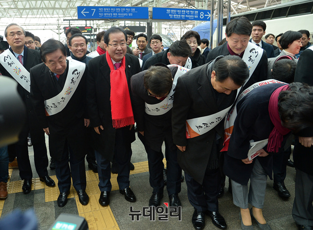 [포토] 귀성객에 허리숙여 인사하는 자유한국당