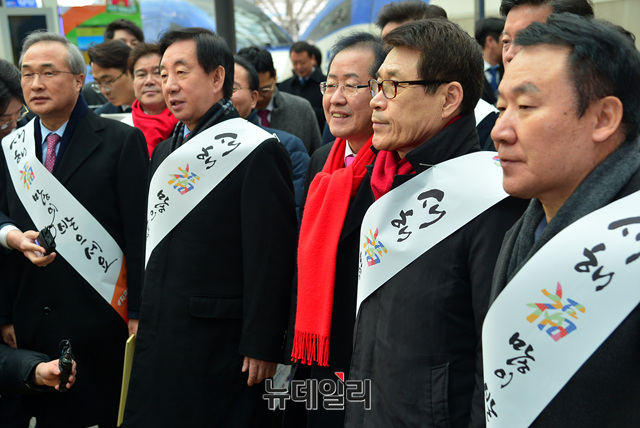 홍준표 자유한국당 대표, 김성태 원내대표 등 지도부가 14일 오전 서울역에서 귀성객을 향해 인사하고 있다.