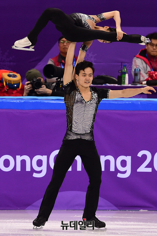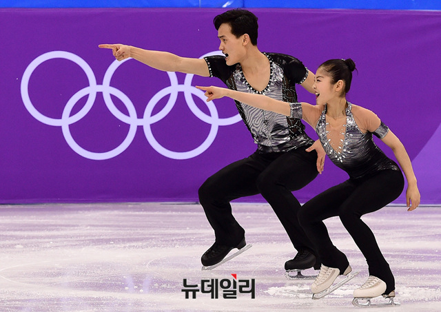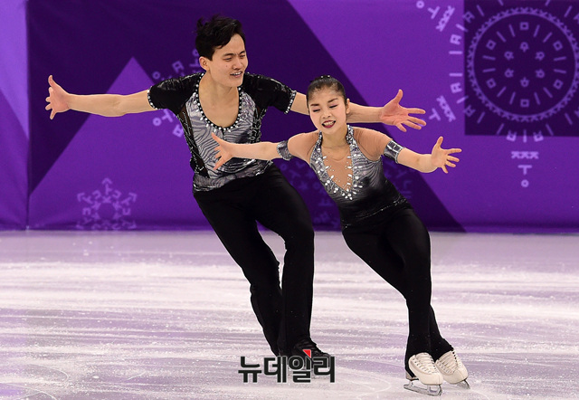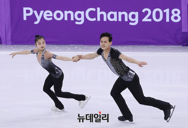 북한 렴대옥과 김주식이 14일 오후 강원도 강릉아이스아레나에서 열린 피켜스케이팅 페어 쇼트프로그램에서 연기를 선보이고 있다. 이날 렴대옥과 김주식은 69.40점으로 22팀 중 11위에 올랐다. (사진=2018평창사진공동취재단)