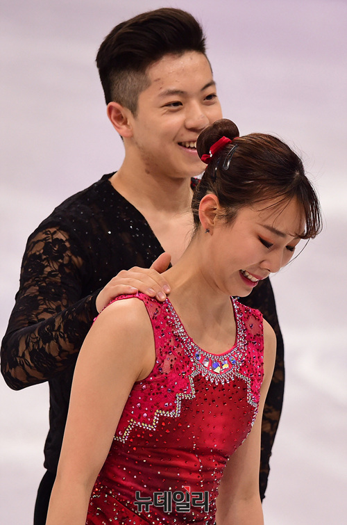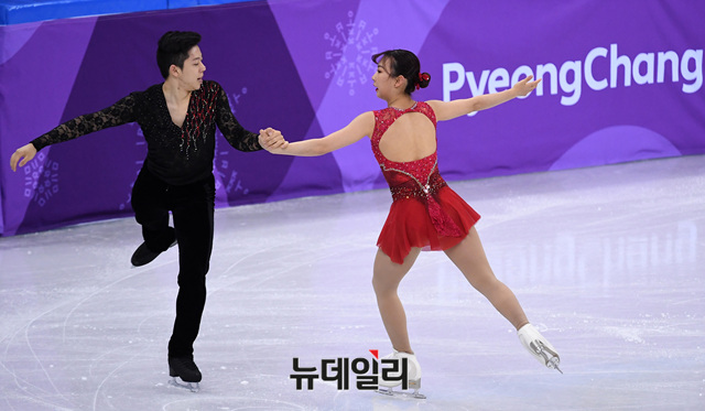 2018 평창동계올림픽에 출전한 김규은, 감강찬이 14일 오후 강원도 강릉아이스아레나에서 열린 피켜스케이팅 페어 쇼트프로그램에서 연기 후 경기장을 나서고 있다. 이날 김규은과 감강찬은 42.93점으로 프리스케이팅 진출이 좌절됐다. (사진=2018평창사진공동취재단)