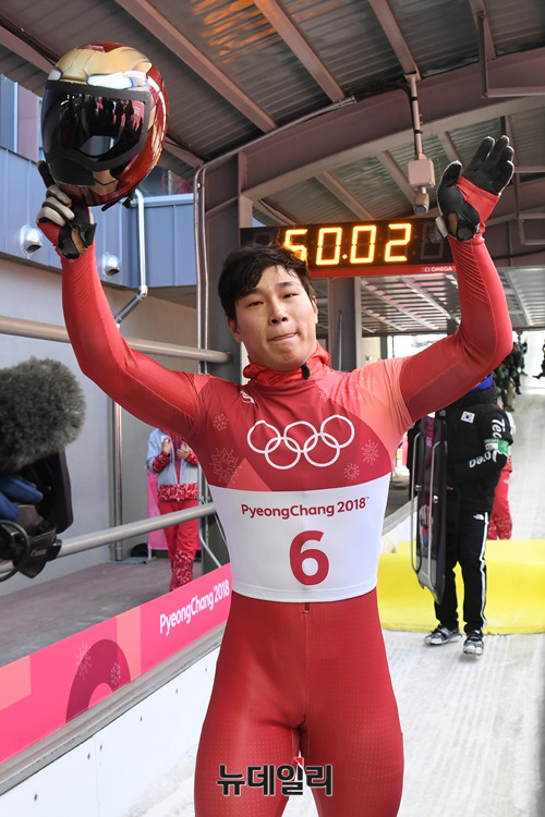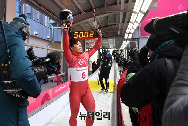 2018 평창 동계올림픽 남자 스켈레톤 경기에 출전한 윤성빈 선수가 16일 오전 강원도 평창 올림픽 슬라이딩센터에서 열린 4차 레이스를 마친 후 금메달을 확정 짓고 뒤 기뻐하고 있다. (사진=2018평창사진공동취재단)