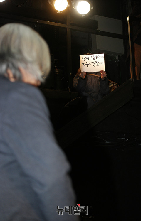 연극연출가 이윤택이 19일 오전 서울 종로구 30스튜디오에서 기자회견을 열고, 성폭행 논란에 대해 공개사과를 하고 있는 가운데 한 여성이 '사죄는 당사자에게, 자수는 경찰에게'가 적힌 피켓을 들고 있다.