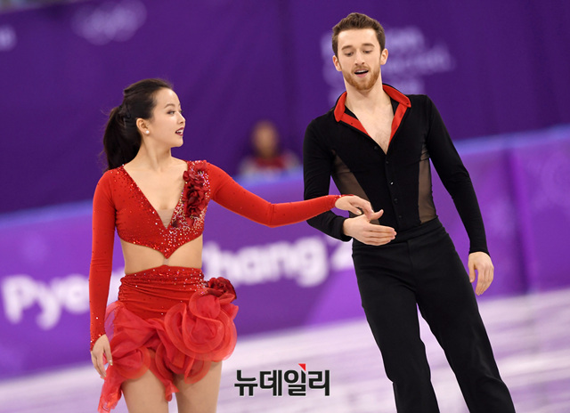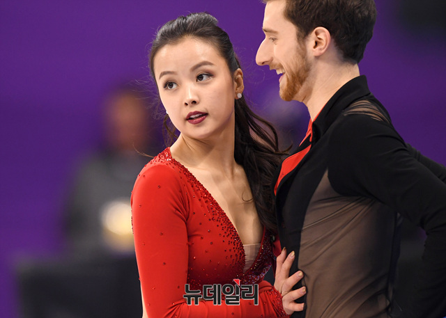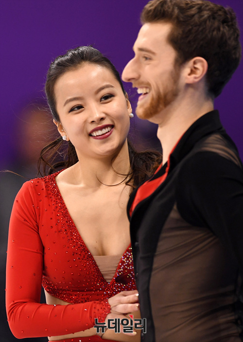 피겨스케이팅 아이스댄스에 출전한 민유라, 알렉산더 겜린(Alexander Gamelin) 조가 19일 오전 강원도 강릉 아이스아레나에서 열린 대회에서 연기 후 포즈를 취하고 있다.