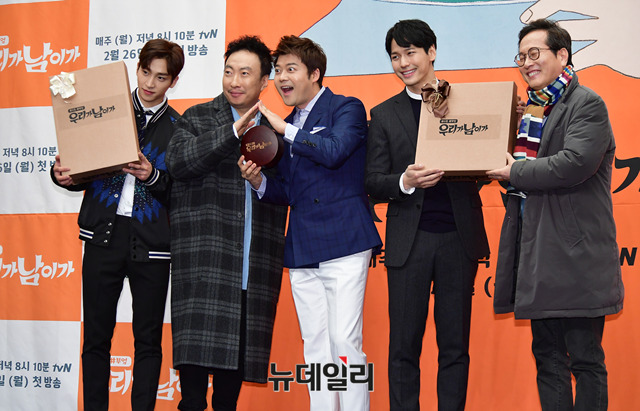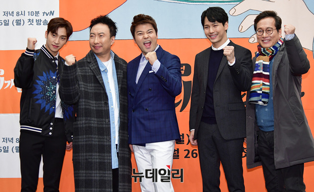 가수 상연, 개그맨 박명수, 방송인 전현무, 배우 지일주, 칼럼니스트 황교익(왼쪽부터)이 20일 오후 서울 마포구 스탠포드호텔 서울에서 열린 tvN '우리가 남이가(연출 이근찬)' 제작보고회에서 포토타임을 갖고 있다.
