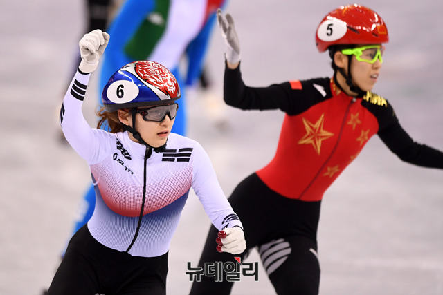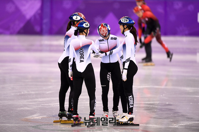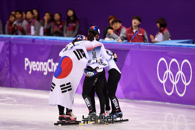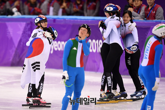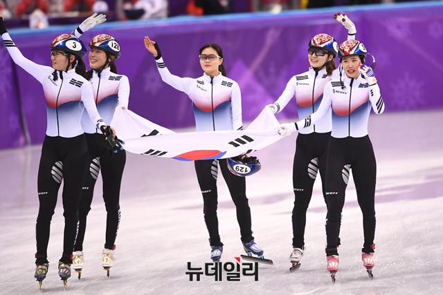여자 계주 대표팀 심석희, 김아랑, 이유빈, 최민정, 김예진이 20일 오후 강원 강릉아이스아레나에서 열린 2018 평창동계올림픽 쇼트트랙 여자 3,000m 계주 결선에 금메달을 획득한 직후 태극기를 흔들고 있다. (사진=2018평창사진공동취재단)