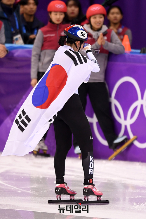 [포토] 금메달 확인하고 태극기 든 쇼트트랙 여자 대표팀