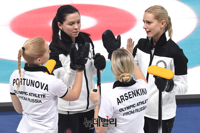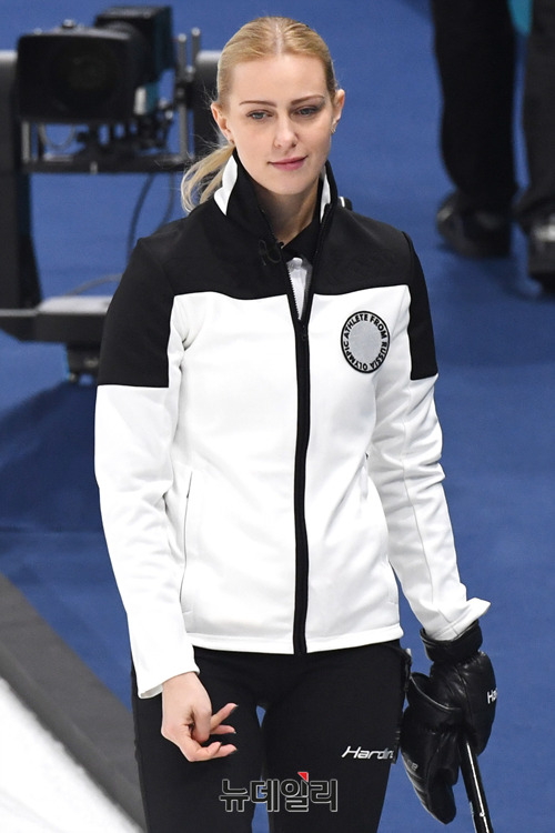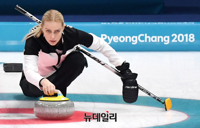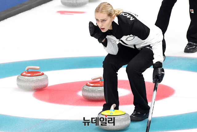 러시아 출신 올림픽 선수 '빅토리아 모이세바'가 21일 오전 강원 강릉컬링센터에서 열린 2018 평창동계올림픽 여자 컬링 예선 한국과 예선전에 출전해 투구하고 있다. (사진=2018평창사진공동취재단)