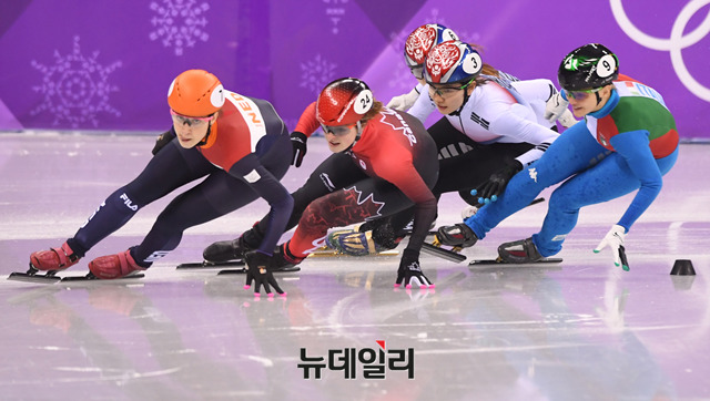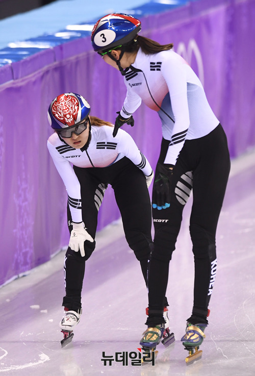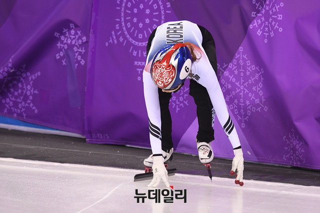 한국 심석희 선수가 22일 오후 강원 강릉아이스아레나에서 열린 2018 평창동계올림픽 쇼트트랙 스피드스케이팅 여자 1,000m 결승에 출전해 레이스 중 미끄러지고 있다. (사진=2018평창사진공동취재단)