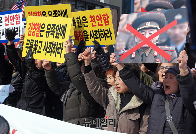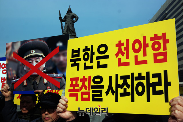 천안함46용사유족협의회가 24일 오후 서울 광화문 광장에서 '천안함 폭침 주범 김영철 방한 규탄' 기자회견을 열고, 김영철 방남을 반대하는 피켓을 들고 있다.