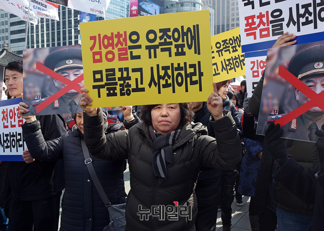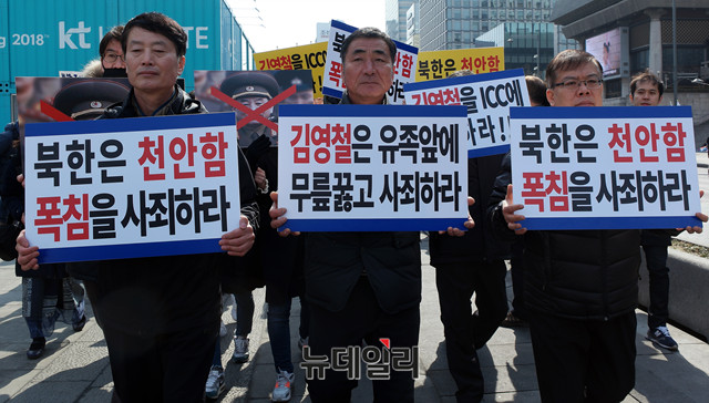 천안함46용사유족협의회가 24일 오후 서울 광화문 광장에서 '천안함 폭침 주범 김영철 방한 규탄' 기자회견을 열고, 정부에 '북한 김영철 방한 철회 촉구' 서한을 전달하기 위해 청와대로 가두행진을 하고 있다.