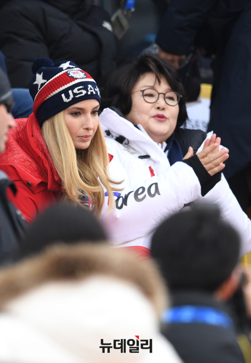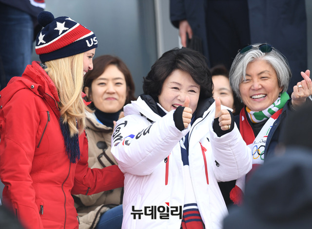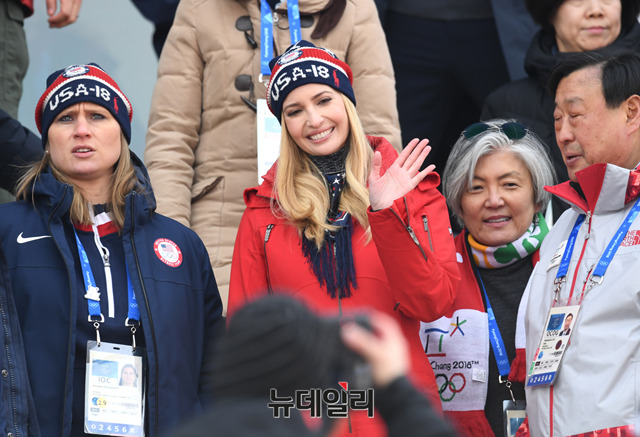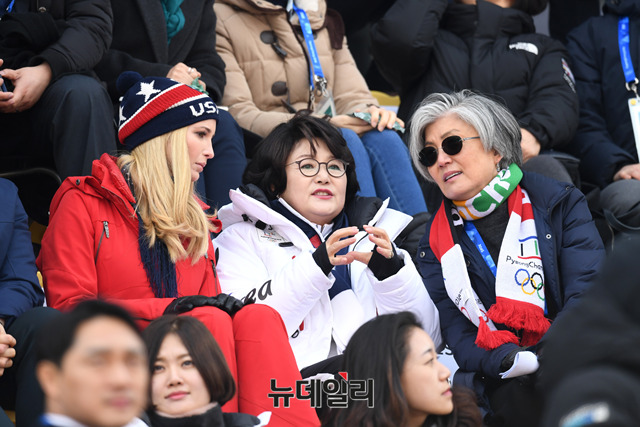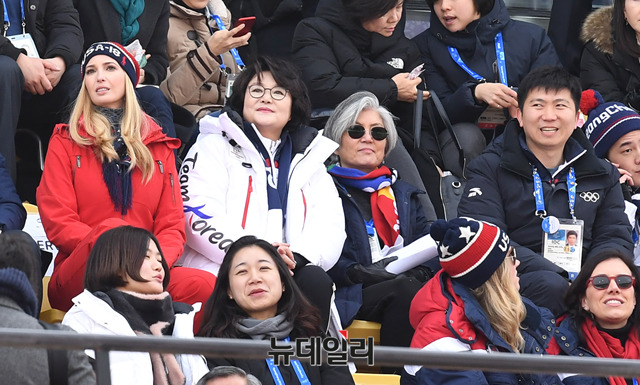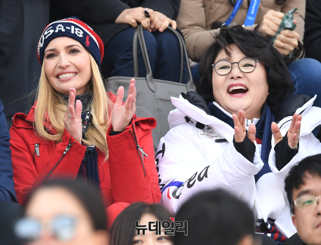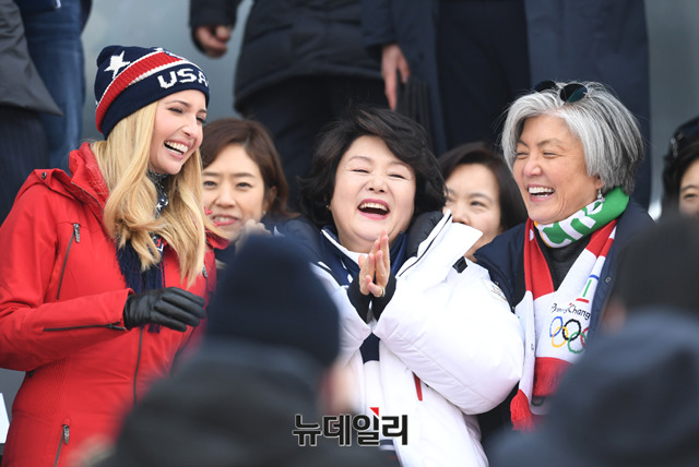 문재인 대통령의 부인 김정숙 여사와 도널드 트럼프 미국 대통령의 장녀 이방카 트럼프 백악관 보좌관이 24일 오전 강원 평창 알펜시아 스키점프 센터에서 열린 평창동계올림픽 스노보드 남자 빅에어 결승전을 관람하고 있다. (사진=2018평창사진공동취재단)
