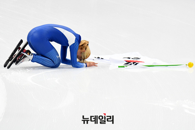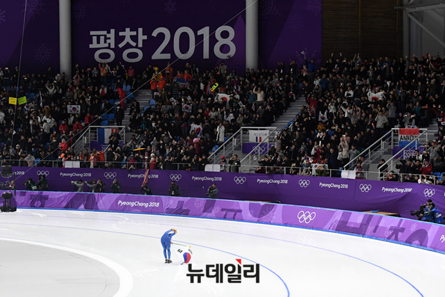 김보름 선수가 24일 오후 강원 강릉스피드스케이팅장에서 열린 2018 평창동계올림픽 스피드스케이팅 여자 매스스타트 결승전에서 은메달을 확정짓고, 관중석을 향해 절을 올리고 있다. (사진=2018평창사진공동취재단)
