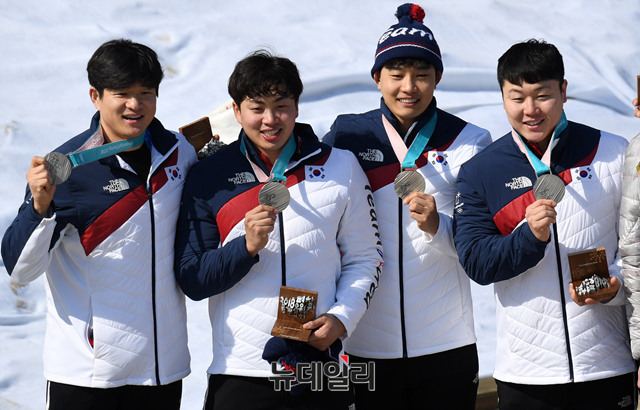 한국 남자 봅슬레이 대표팀(원윤종, 서영우,김동현, 전정린)이 25일 오전 강원도 평창 올림픽슬라이딩센터에서 열린 2018 평창동계올림픽 남자 봅슬레이 4인승 시상식에서 은메달을 수상 후 기뻐하고 있다. (사진=2018평창사진공동취재단)
