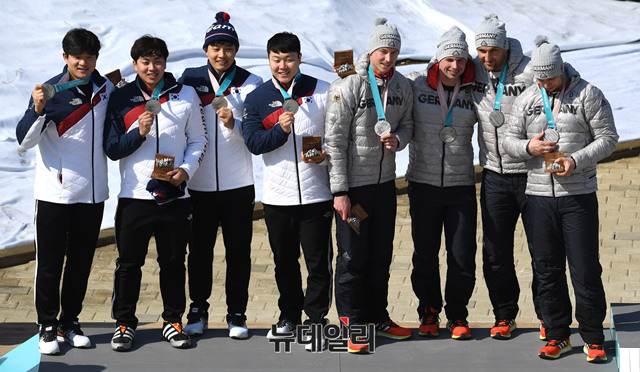 [포토] 은메달 수상하는 한국 남자 봅슬레이 대표팀