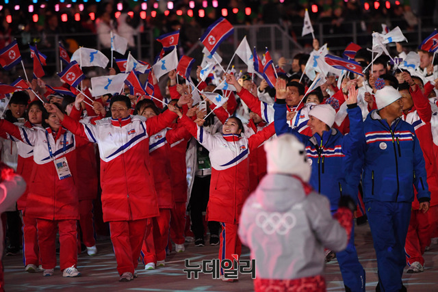 북한선수단이 25일 오후 강원 평창올림픽스타디움에서 열린 2018평창동계올림픽 폐회식에 입장하고 있다. (사진=2018평창사진공동취재단)