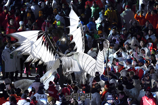 사람의 형상을 한 인면조가 25일 오후 강원도 평창군 올림픽스타디움에서 열린 '2018 평창동계올림픽 폐막식'에서 공연을 선보이고 있다.이날 폐막식에는 문재인 대통령 내외, 이방카 트럼프(Ivanka Trump) 미국 백악관 보좌관, 북한 김영철 등이 참석했다. 또 그룹 엑소(EXO)와 가수 씨엘(CL)이 출연하고 중국의 장이머우(張藝謨) 감독이 오는 2022년 차기 동계올림픽 개최 도시인 베이징을 알리는 공연을 선보였다.이번 올림픽에서 한국은 금메달 5개, 은메달 8개, 동메달 4개 등 총 17개의 메달을 수확해 종합성적 7위에 머물렀다. 오는 3월 9일부터 강원도 평창, 강릉, 정선 일대에서 2018 평창동계패럴림픽이 시작된다. (사진=2018평창사진공동취재단)