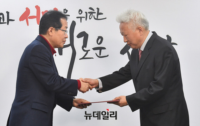홍준표 자유한국당 대표가 26일 오전 서울 여의도 중앙당사에서 열린 '6.13 지방선거 및 국회의원 재보궐선거 중앙당 공천관리위원회 임명장 수여식'에서 부위원장으로 임명한 류석춘 전 혁신위원장과 기념촬영을 하고 있다.