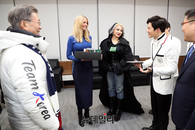 문재인 대통령 내외가 25일 오후 강원 평창올림픽스타디움에서 열린 2018평창동계올림픽 폐회식 직후 이방카 트럼프 백악관 보좌관, 아이돌그룹 엑소와 함께 기념촬영을 하고 있다. (사진=청와대)