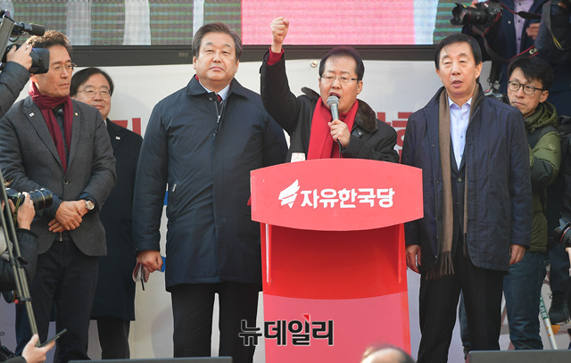 김무성 자유한국당 의원, 홍준표 대표, 김성태 원내대표(왼쪽부터)가 26일 오후 서울 중구 청계광장에서 열린 '천안함 폭침 주범 김영철 방한 규탄대회' 말미에 연단에 올라 "청와대 주사파 물러가라"라는 구호를 외치고 있다.