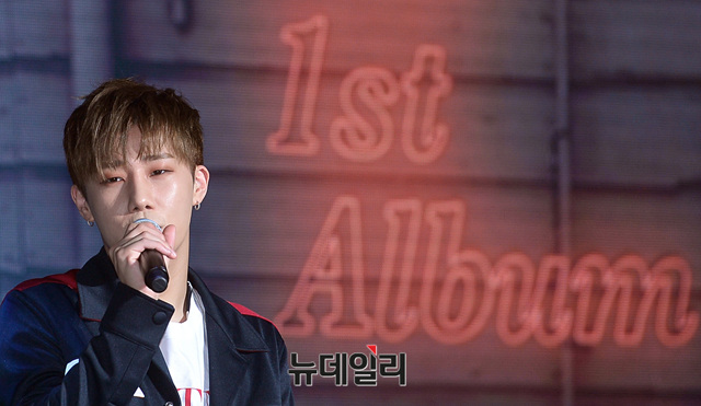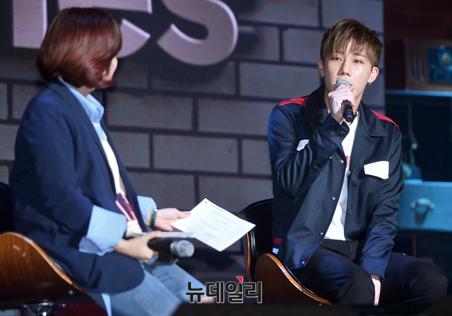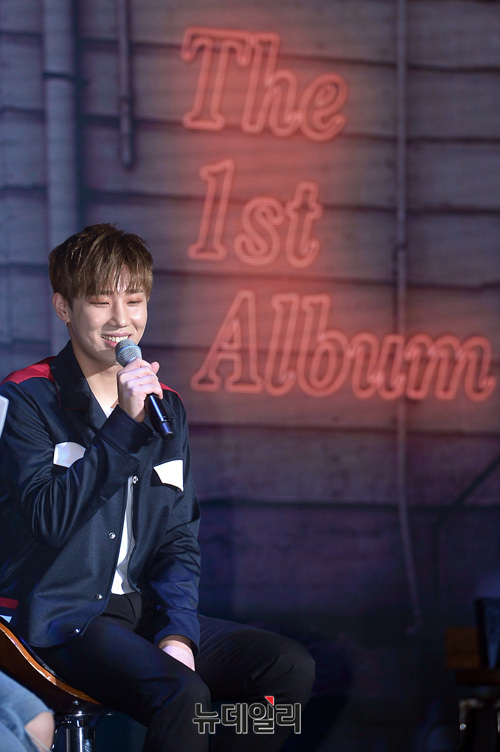 그룹 인피니트 김성규가 26일 오후 서울 마포구 신한카드 판스퀘어에서 열린 첫 번째 솔로 정규앨범 '텐스토리즈(10 Stories)' 발매 기념 쇼케이스에 참석해 질문에 답하고 있다.