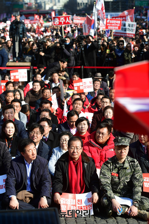 홍준표 자유한국당 대표가 26일 오후 서울 중구 청계광장에서 열린 '천안함 폭침 주범 김영철 방한 규탄대회'에 참석해 발언하고 있다.