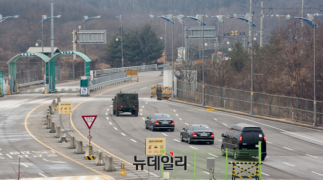 북한 김영철이 27일 오전 출경을 위해 경기 파주시 남북출입사무소(CIQ)로 향하고 있다. 이날 김영철 일행은 통일대교에서 집회하는 자유한국당을 피해 역주행으로 남북출입사무소를 향했다.