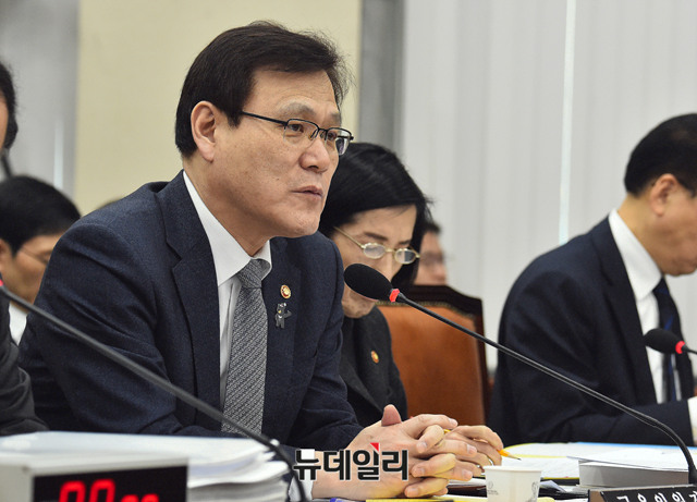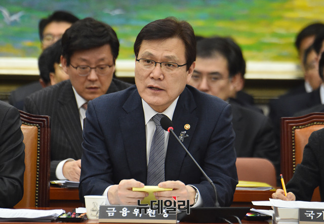 최종구 금융위워장이 27일 오후 국회에서 열린 국회 정무위원회 전체회의에서 의원들의 질의에 답변하고 있다.