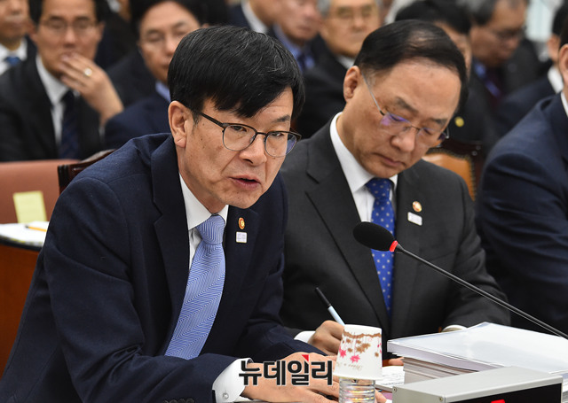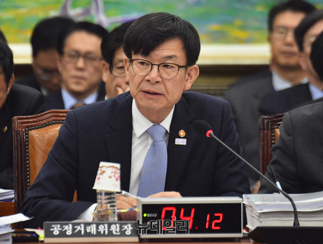 김상조 공정거래위원장이 27일 오후 국회에서 열린 국회 정무위원회 전체회의에서 의원들의 질의에 답변하고 있다.