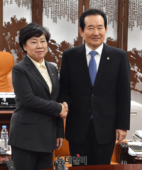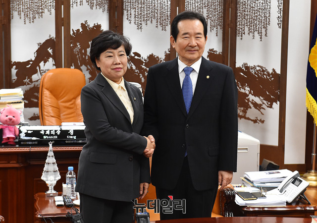 조배숙 민주평화당 대표가 28일 오전 국회 의장집무실에서 정세균 국회의장을 만나 기념사진을 촬영하고 있다.