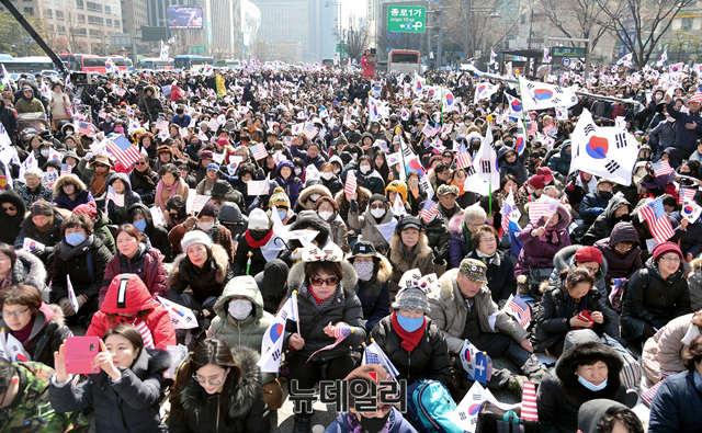 '구국과 자유통일을 위한 3.1절 한국교회 회개의 금식기도대성회 및 범국민대회'에 참석한 시민들이 1일 오후 서울 종로구 광화문 사거리에서 기도를 하고 있다.
