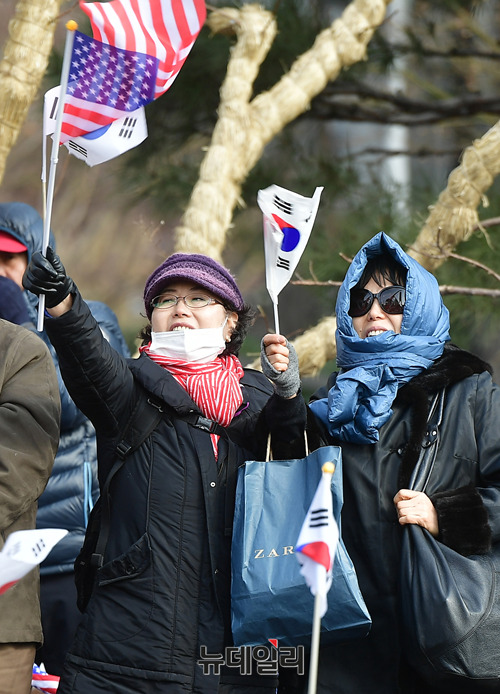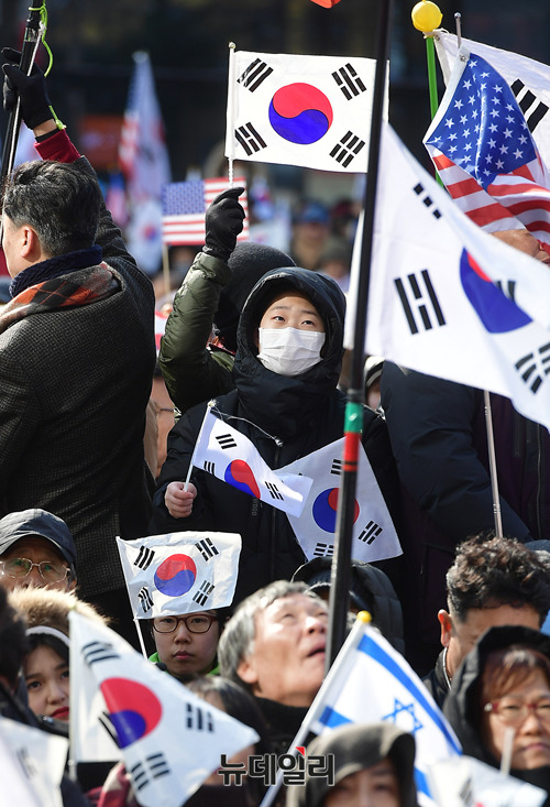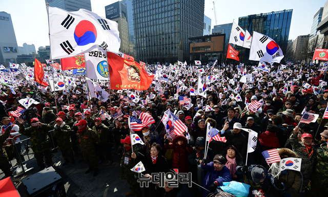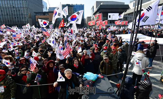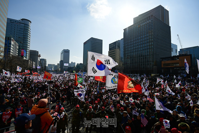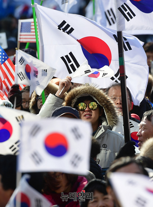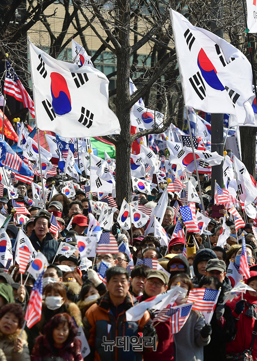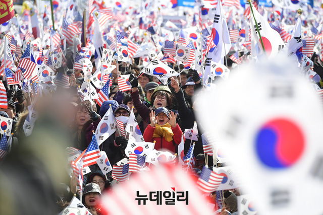 3.1절 구국기도회 및 범국민대회가 1일 오전부터 광화문 광장에서 열린 가운데 참가자들이 태극기와 성조기를 흔들며 한미동맹 강화를 외치고 있다.