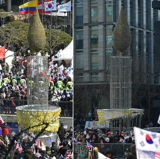 3.1절 구국기도회 및 범국민대회가 진행중이던 1일 오후 광화문광장의 촛불탑 모습. 이날 본격적인 대회가 시작될 무렵 (오후 1시, 왼쪽)과 마무리 될 무렵(오후 3시 20분, 오른쪽) 반대쪽 에서 각각 찍힌 사진.
