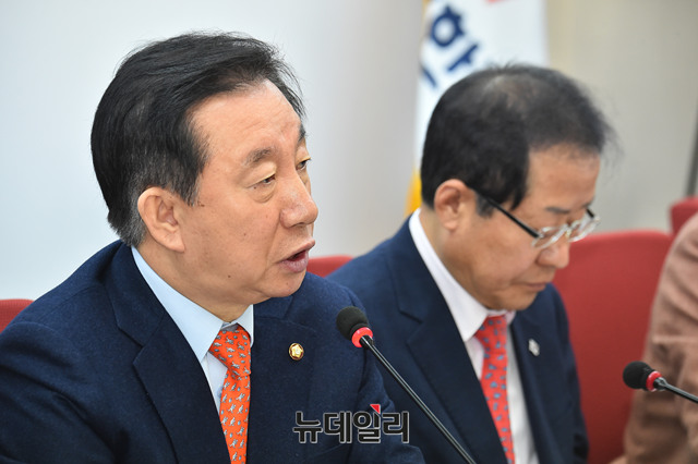 김성태 자유한국당 원내대표가 2일 오전 서울 여의도 자유한국당 중앙당사에서 열린 확대 당직자회의에서 모두발언을 하고 있다.