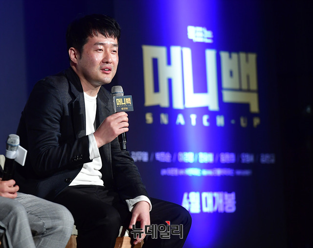 허준형 감독이 5일 오전 서울 광진구 롯데시네마 건대입구에서 열린 영화 '머니백(감독 허준형)' 제작보고회에서 인사말을 하고 있다. 머니백은 돈가방 하나에 엮인 7명의 예측불가 추격전을 다룬 범죄오락 영화로 오는 4월 개봉을 앞두고 있다.