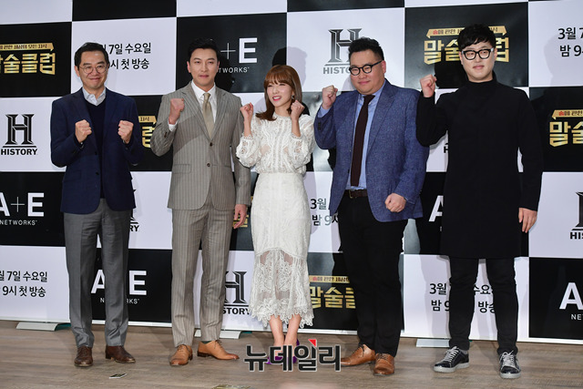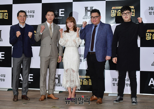장진 감독, 배우 박건형, 레인보우 지숙, 명인 칼럼니스트, 김중혁 소설가(왼쪽부터)가 5일 오후 서울 강남구 드레스가든에서 열린 말술클럽 제작보고회에서 포토타임을 갖고 있다.말술클럽은 '술에 관한 세상의 모든 지식'이라는 콘셉트 아래 출연진들이 우리나라 전통주를 찾아 인문학적인 이야기를 나눠보는 인문학 예능 프로그램으로 채널 히스토리에서 오는 7일 첫 방송된다.장진 영화감독, 주류문화 칼럼니스트 명욱, 소설가 김중혁, 배우 박건형, FT아일랜드 최종훈 등이 출연한다.
