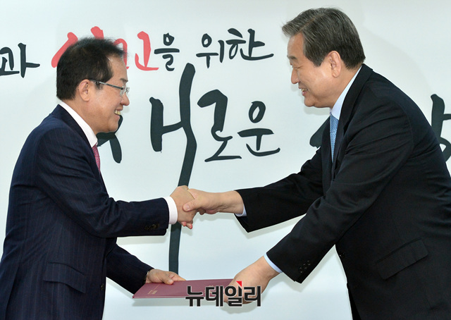 홍준표 자유한국당 대표와 김무성 의원이 5일 오후 서울 여의도 중앙당사에서 열린 '북한핵폐기추진특위-경제파탄대책특위원장 임명장 수여식'에 참석해 임명장 수여 후 기념촬영을 하고 있다.