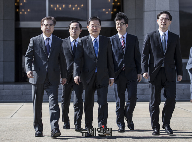 정의용 청와대 국가안보실장을 비롯한 대북 특별사절 대표단이 5일 오후 경기 성남 서울공항에서 특별기에 탑승하기 직전 기념촬영을 하고 있다. (왼쪽부터 윤건영 청와대 국정상황실장, 특사 서훈 국가정보원장, 수석특사 정의용 국가안보실장, 천해성 통일부 차관, 김상균 국정원 2차장.)(사진=청와대)