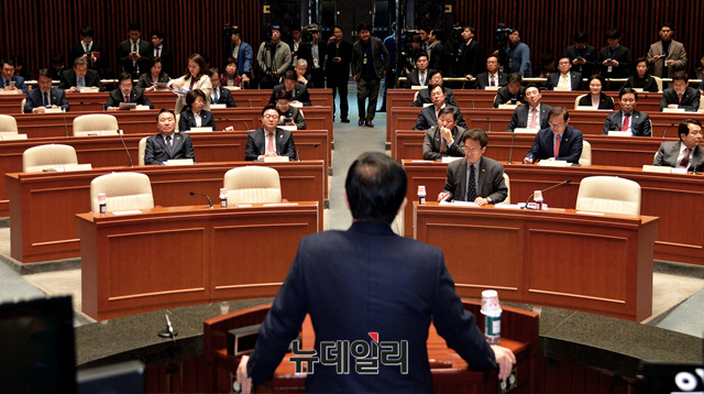 김성태 자유한국당 원내대표가 5일 오후 국회에서 열린 의원총회에 참석해 발언하고 있다.