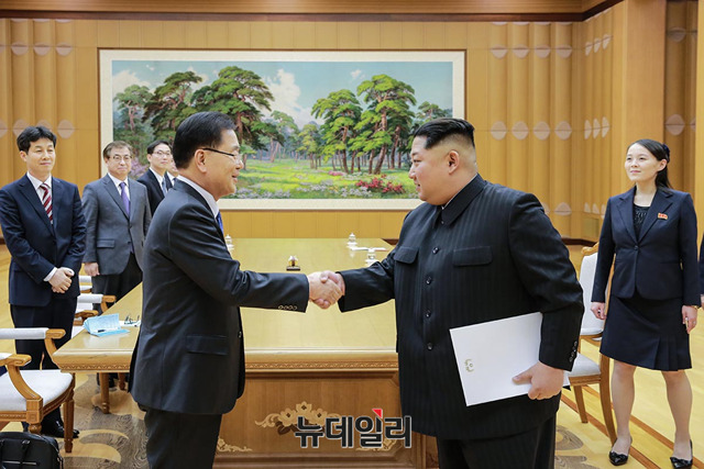 지난 5일 전용기로 북한을 방문한 대북 특사단이 김정은과 기념촬영을 하고 있다. (왼쪽부터 윤건영 청와대 국정상황실장, 정의용 수석특사, 김정은, 서훈 국정원장, 천해성 통일부 차관, 김상균 국정원 2차장)(사진=청와대)
