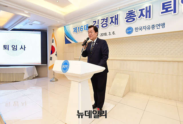 김경재 한국자유총연맹 총재가 6일 오전 서울 중구 한국자유총연맹 대강당에서 열린 퇴임식에서 퇴임사를 하고 있다.
