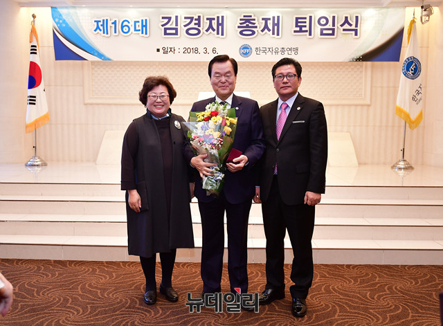 김경재 한국자유총연맹 총재가 6일 오전 서울 중구 한국자유총연맹 대강당에서 열린 퇴임식에서 재직기념패와 꽃다발을 들고 있다.