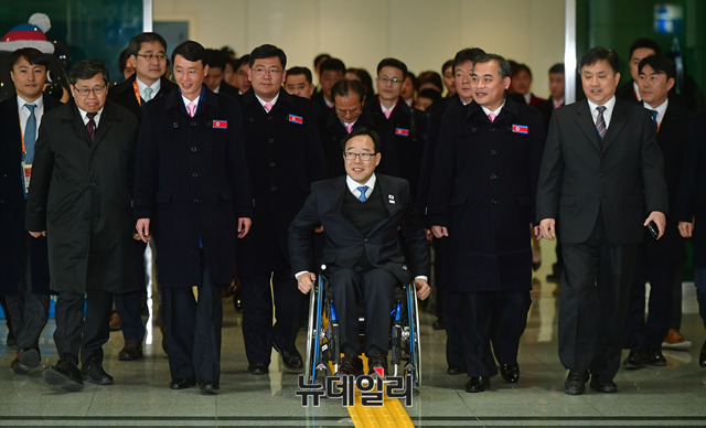 임찬규 평창동계패럼림픽 국장(가운데)을 비롯한 평창동계패럴림픽에 참가하는 북한 선수단과 대표단 24명이 7일 오전 경기 파주시 남북출입사무소(CIQ)를 통해 입경하고 있다. 통일부에 따르면 북한의 동계패럴림픽 참가는 이번이 처음이다. (경기 파주=뉴데일리 정상윤 기자)