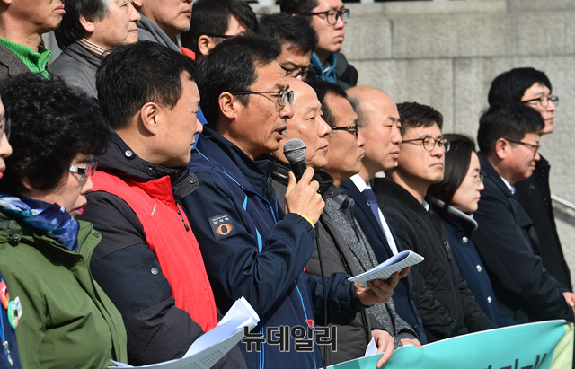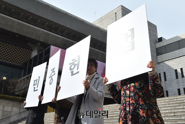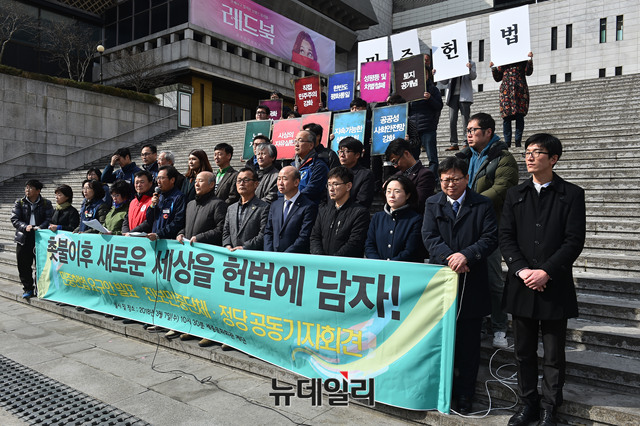 '촛불이후 새로운 세상을 헌법에 담자' 진보민중진영 공동기자회견 참가자들이 7일 오전 서울 종로구 세종문화회관 앞에서 민중헌법 촉구 기자회견을 갖고 있다.