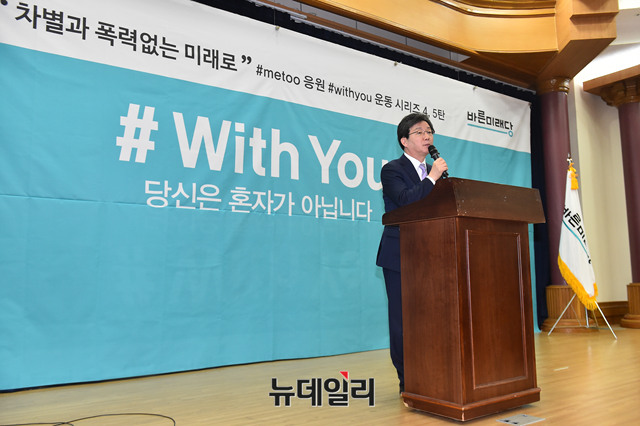 유승민 바른미래당 공동대표가 8일 오전 국회 의원회관에서 3.8 세계 예성의 날을 맞아 열린 '차별과 폭력 없는 미래로' 대회에서 축사 하고 있다.
