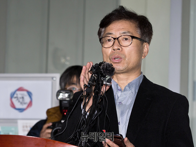 한준섭 충남도청 공보관이 8일 오전 충남 홍성군 충남도청에서 예정된 안희정 전 충남지사의 기자회견 취소를 알리고 있다.